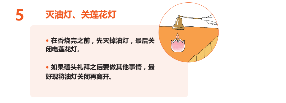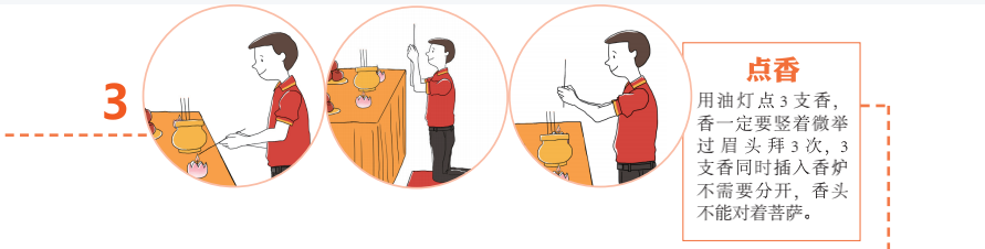 2.点香(用油灯点香,可以每个香炉 3 支香,香一定要竖着微举过 眉头拜3次,多支香同时插入香炉不需要分开,香头不能对着菩薩)
