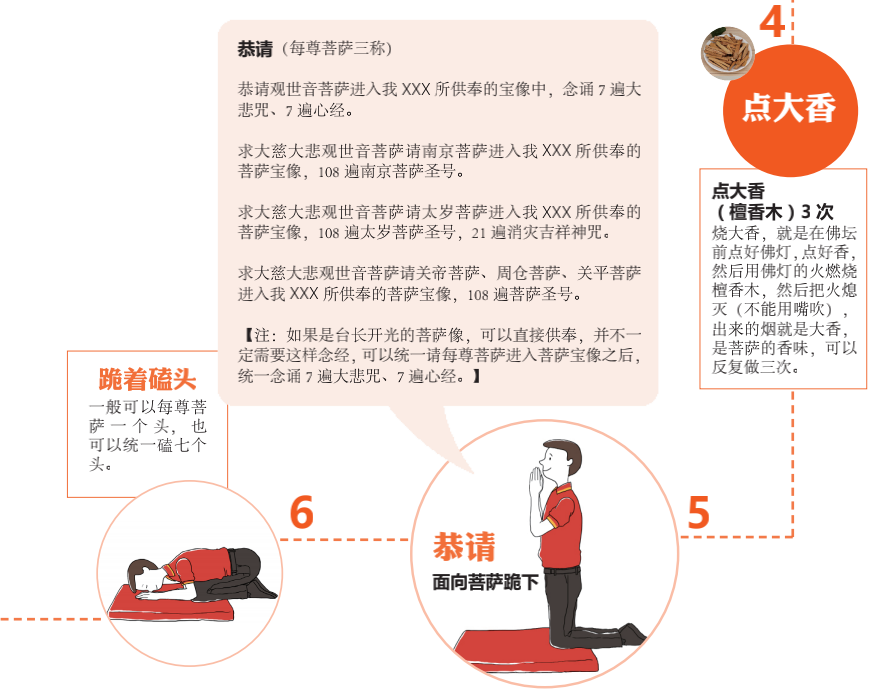 5.恭请(每尊菩薩三称) :南无释迦牟尼佛、南无大慈大悲救苦救难广大灵感观世音菩薩摩诃萨、南无南京菩薩、南无太岁菩薩、南无关帝菩薩、南无周仓菩薩、南无关平菩薩…… (您所供奉的每尊菩薩各三称)